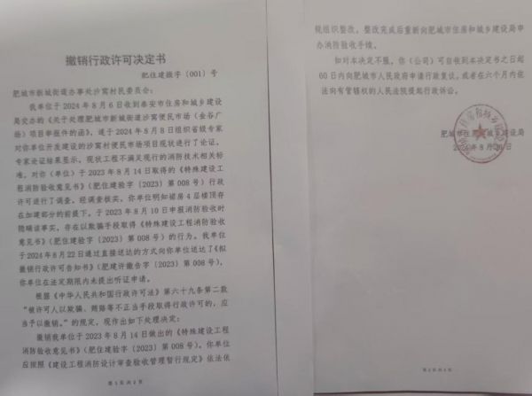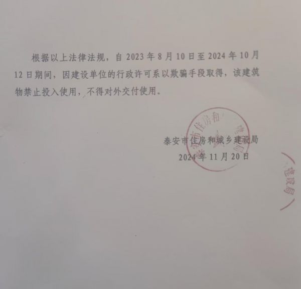 消防验收“合格变无效”:2023年8月14日,肥城市住建局出具《特殊建设工程消防验收意见书》,评定项目合格。但在骏鑫公司持续信访、专家论证指出“建筑高度超过24米应按一类高层公共建筑设计”后,该局于2024年8月20日以“建设单位以欺骗手段取得行政许可”为由,撤销该意见书。泰安市住建局后续复函明确指出,2023年8月10日至2024年10月12日期间,该建筑“禁止投入使用,不得对外交付使用”。